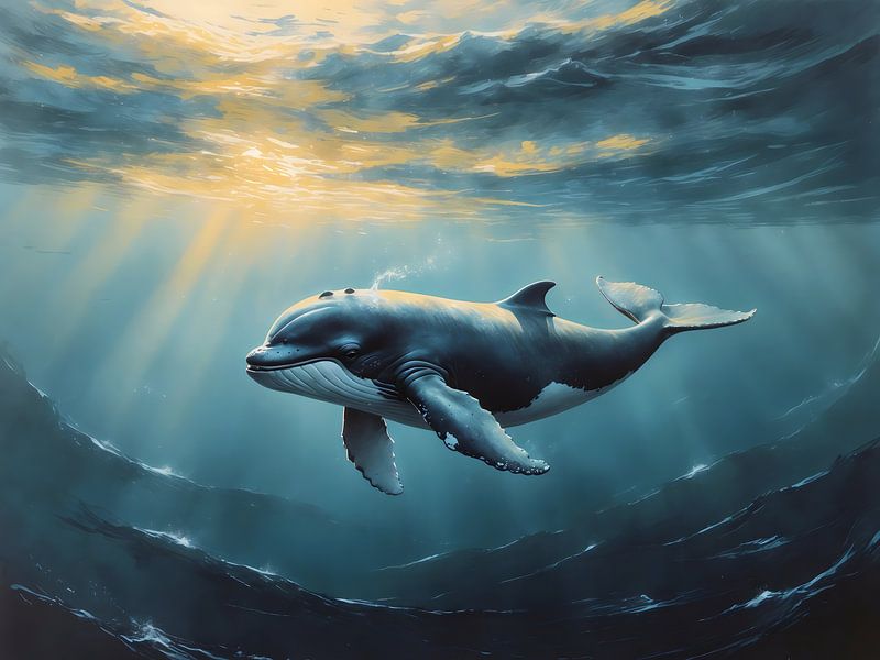 This work depicts a whale in the bright, early light beneath the water's surface. Sunbeams break through the waves and illuminate the deep blue, as if the ocean itself is slowly awakening. The animal's movement is calm and fluid, carried by the rhythm of the water.