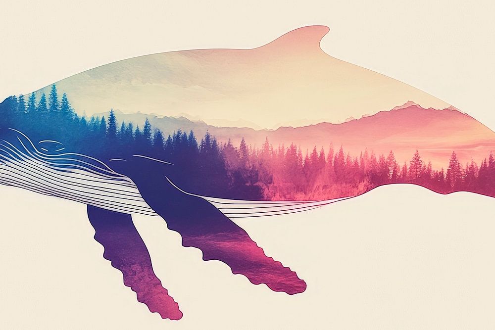 A majestic whale looks as if it has sprung from a dream, its contours filled with soft colours and a vivid landscape. The harmonious combination of nature and the sea creates a calming atmosphere, ideal for the bedroom, where every glance at the work of art promises relaxation and freedom. A perfect companion for peaceful nights.