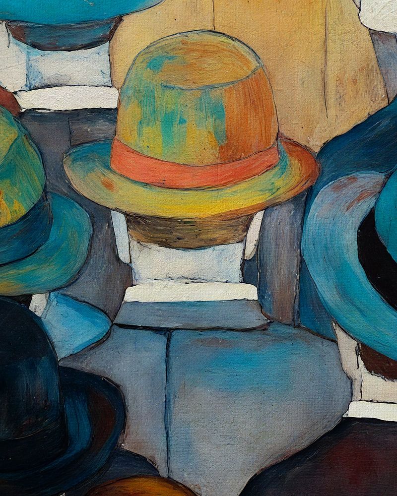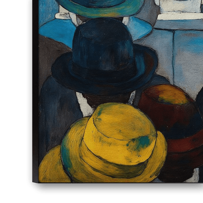 The painting is about this interesting mix of individuality and anonymity within a group. Looking at it from above, you see a group of men in hats who together form a kind of sea of earthy colours. They are all pretty much the same, but their hats make them look like masks, hiding their identity and creating this rhythm of sameness. But then you see that one man's face is visible, just the top, through the brim of his hat, and it looks like he is secretly rebelling against having to belong. It is a subtle nod to the constant struggle for individuality in a world that often forces you to belong. They all look in the same direction, silently united by a shared purpose. Their collective gaze suggests something intangible or universal, like the human desire for connection or purpose.The earthy colours ground the scene in reality, both physical and spiritual, and leave us pondering whether unity weakens or strengthens identity. It makes you think about belonging, standing apart and hoping.