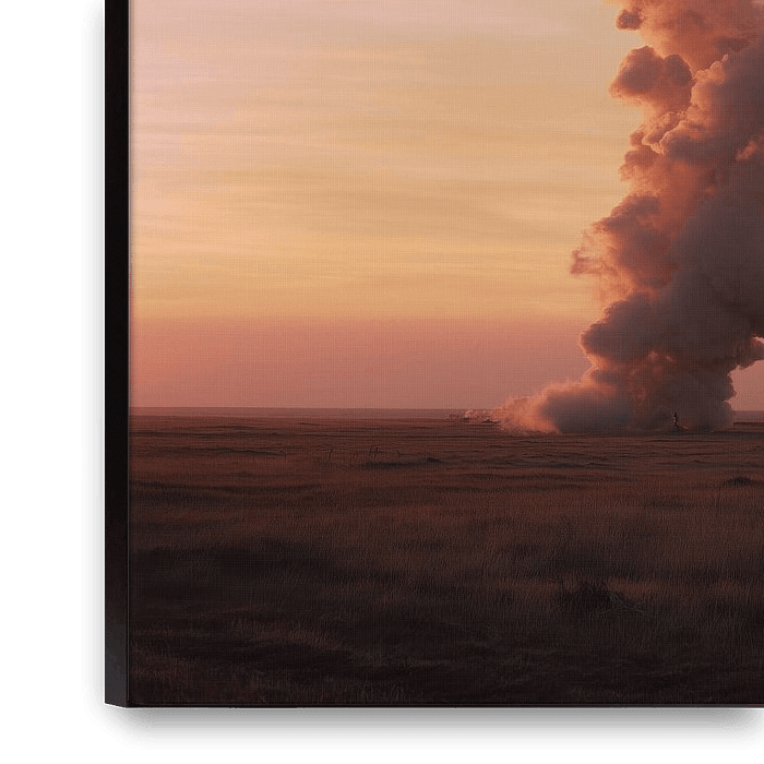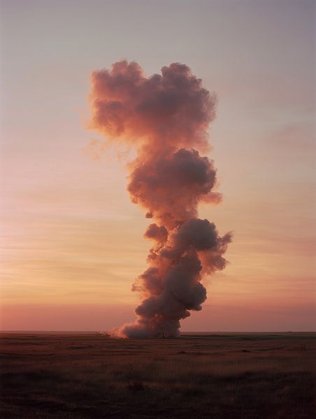 In a vast and desolate landscape, a column of smoke rises, massive and slow, as if deliberately pushed into the sky. The fire itself is barely visible; the moment is not about the flames, but what they leave behind. The smoke catches the last light of the day and turns soft pink, orange and grey, while the sun has already sunk below the…