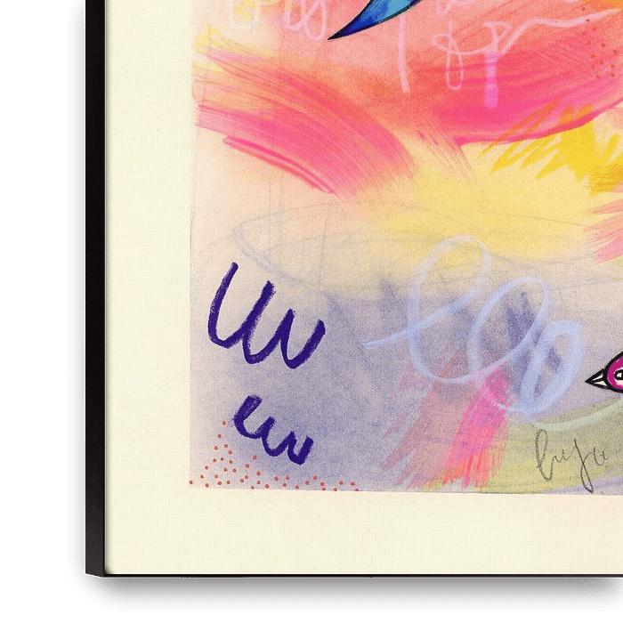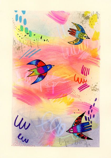 This unique work of art combines a playful lightness with a modern, abstract aesthetic. Three stylised, colourful birds appear to fly weightlessly through a vibrant composition of bold brushstrokes, delicate colour gradients and dynamic graphic elements. The harmonious blend of warm pinks, yellows and oranges, alongside contrasting…