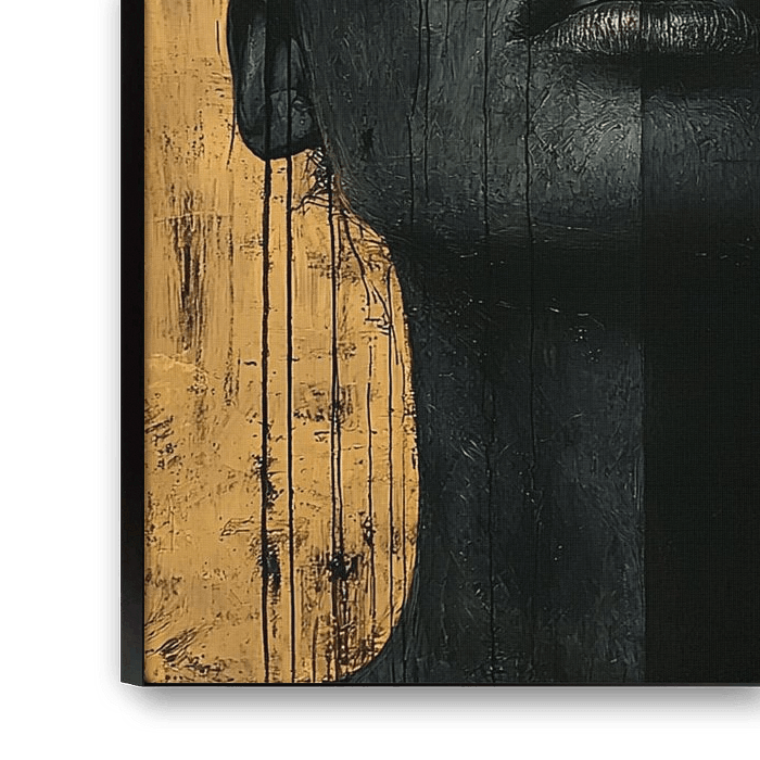 An intriguing painting shows a woman's face partially disappearing in gold and black drip effects. The paint drips over her serene face like tears or raindrops, evoking a sense of mystery and power. The contrast between the shiny gold and deep black enhances the dramatic, almost dreamlike look.