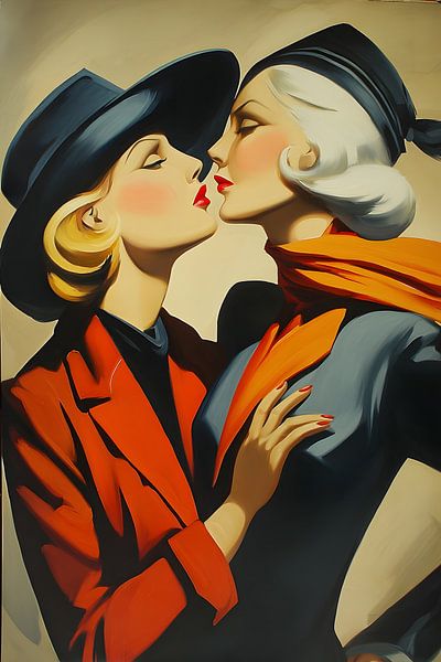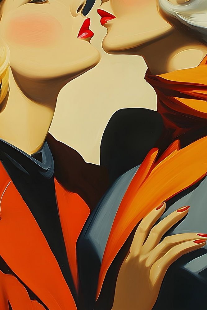 Two elegantly stylised women in a retro style lean towards one another, moments before a kiss. Clean lines, smooth surfaces and warm contrasts of red, black and beige characterise the composition. Their clothing and accessories evoke classic fashion aesthetics, whilst their restrained facial expressions intensify the sense of intimacy…