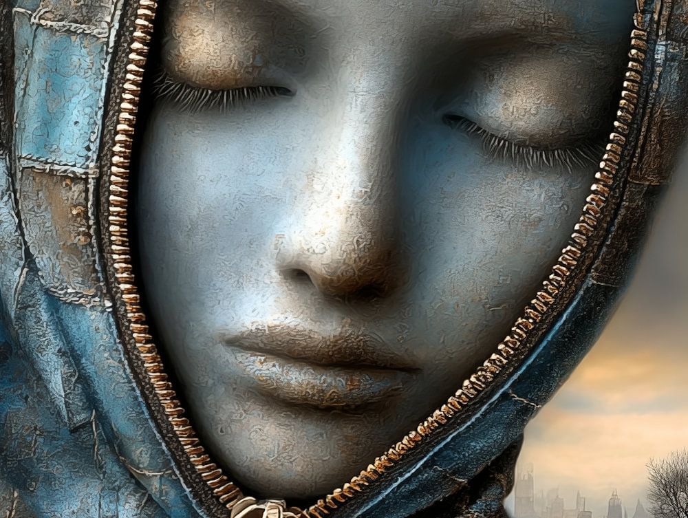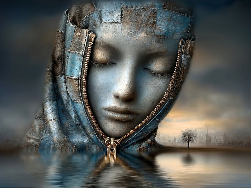 This series shows faces constructed from fragments, seams and rich layers of texture. The closed eyes give the portraits a quiet tranquillity, while the surface is reminiscent of patchwork, leather and weathered materials. A zip forms a striking line in the image: not as a separation, but as a way of holding different parts…