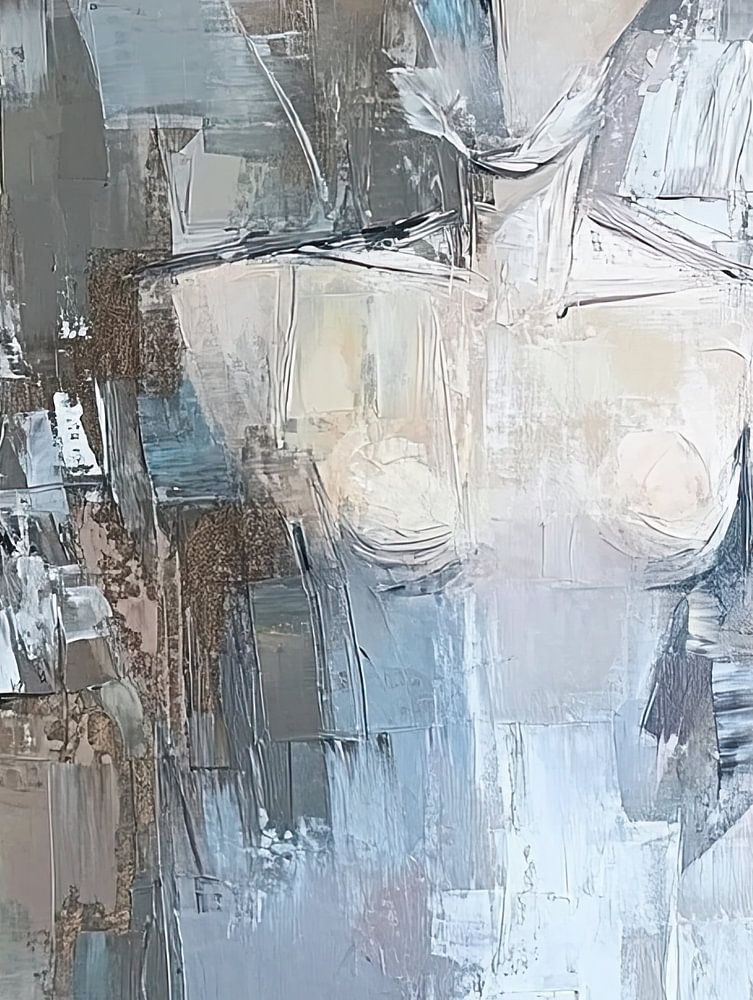Whispered Textures - This abstract painting shows a composition of mixed textures and smudges in mostly neutral colours, creating a soothing yet dynamic visual experience.