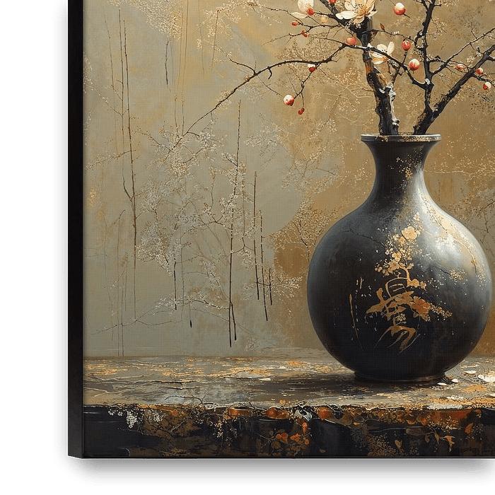 Details: still life, blossom, vase, modern, Japandi, simplicity, earth tones, black, white, brown