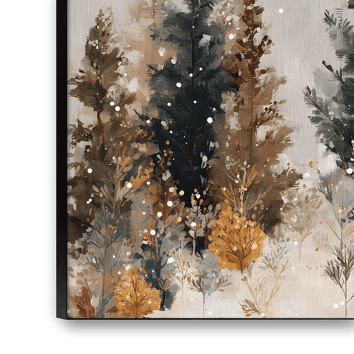 An atmospheric winter forest with tall pines and falling snow. Brings peace, nature and magic into your home.