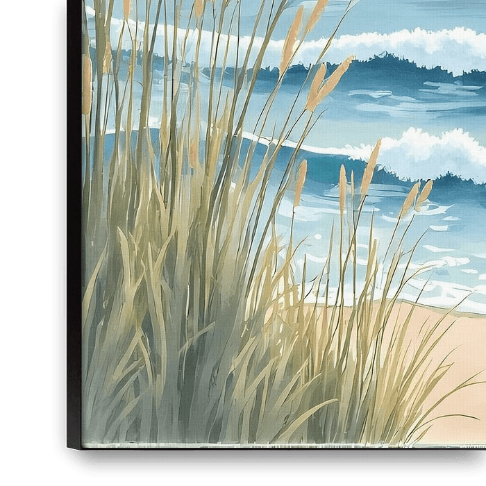 This tranquil artwork captures a peaceful scene at the edge of the ocean. Gentle waves with foamy white crests roll towards a sandy beach, framed by swaying sea grasses on either side. The soft hues of blue in the water transition from deeper tones in the distance to lighter shades near the shore, creating a sense of depth and calm. The…