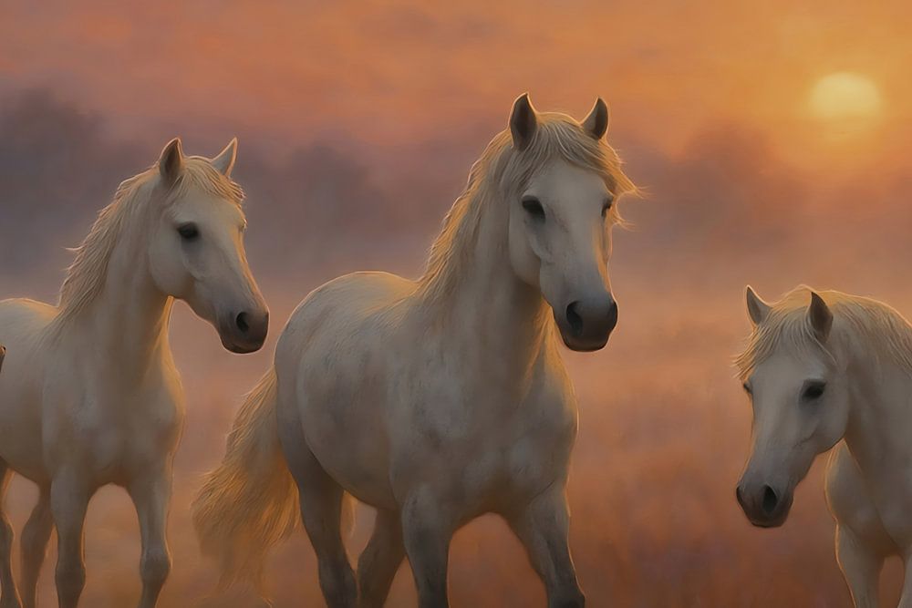 A group of white horses move gracefully through a soft purple moor as the sun slowly rises behind a thin layer of morning mist. The warm glow of the sun fills the sky with shades of orange, pink and purple, giving the landscape an almost magical appearance. The horses seem both free and connected, and together they form a harmonious image of nature, elegance and tranquillity. This artwork breathes silence and movement at the same time, as if the viewer is in the middle of nature on an early, serene morning.