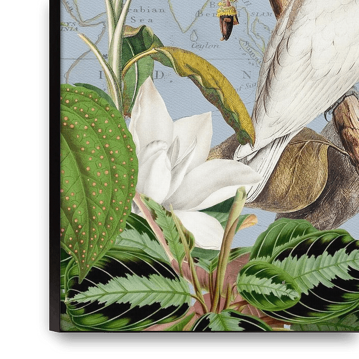 Immerse your room in timeless elegance with a vintage jungle wall mural from Uta. Two graceful white cockatoos sit amidst towering palm trees, surrounded by lush green foliage and delicate white exotic flowers. The light blue map-inspired background adds a touch of wanderlust and sophistication, evoking the charm of historical…
