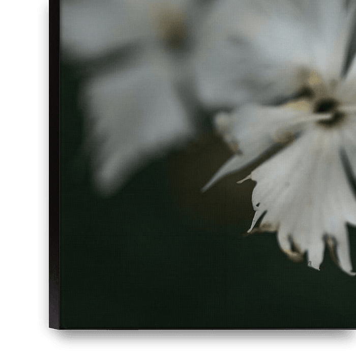 Buy this flower art White flower of Dianthus arenarius against a dark background with copy space, close-up, selected foc by Maren Winter on canvas, ArtFrame, poster and wallpaper, printed on demand in high quality.