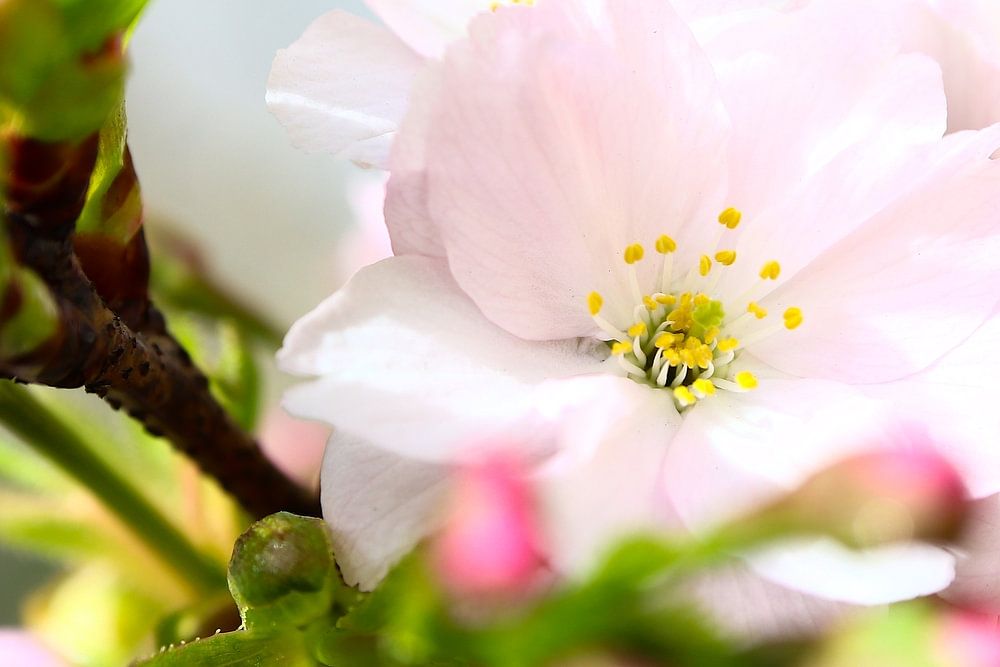 White pink blossom macro photography. The photo was taken with a macro lens so the background of the photo is blurred.