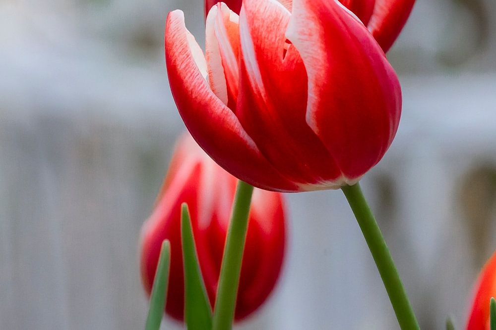 White red triumph tulip Leen van der Mark in front of a diffuse white background