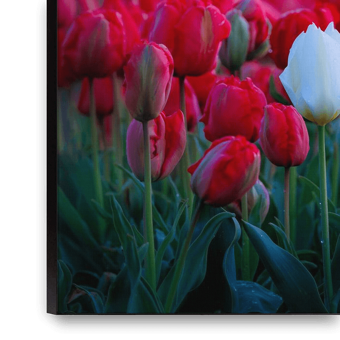 This white tulip was clearly not intended but so forms a nice contrast in the red tulip field. I used a big zoom lens to take this picture (300mm).
