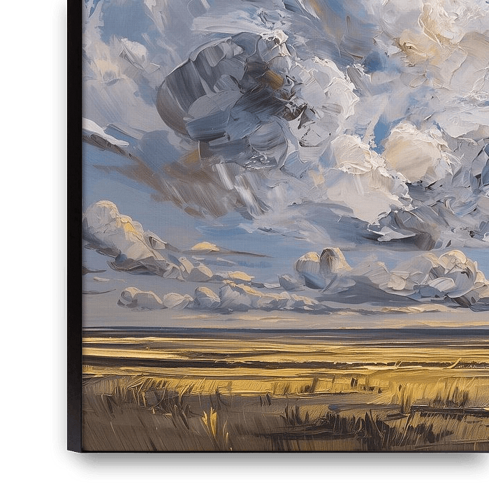 This impressive landscape artwork depicts an open plain beneath an imposing sky filled with powerful, light-filled cloud formations. The dynamic, impressionistic painting style lends movement and depth to the sky, while the tranquil landscape below radiates vastness and freedom. The interplay of light, sky and earth creates an…