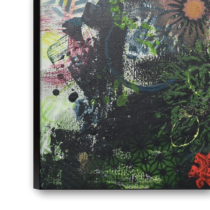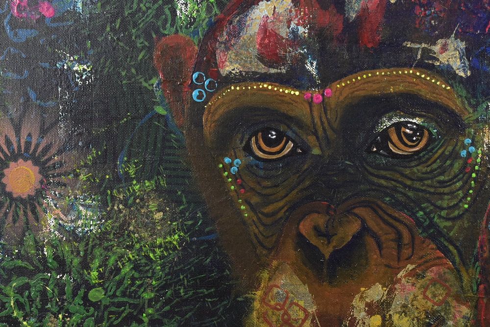I am a child of the forest, surrounded by colour and sound. My fur catches the light of a thousand flowers, my eyes reflect the echo of ancient secrets. I smile not to mock, but to celebrate: life, play, freedom vibrating in every leaf. In my gaze dances the jungle itself, wild, full of joy, full of life.