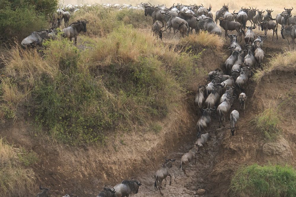 A large herd of wildebeest crosses the river in Tanzania. A total of 2 million animals travel a total of 700 km, from the Serengeti in Tanzania to the Masai Mara in Kenya and back again, chasing the green grass. What a spectacle!