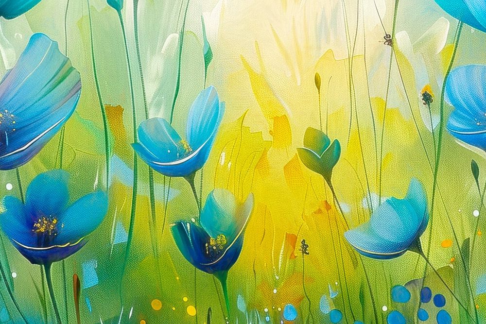 Blue flowers glow in radiant colours and seem to dance in the soft sunlight on a lively meadow. The interplay of blue and green tones creates an uplifting atmosphere and conveys a feeling of serenity and joy. Delicate and ethereal, the composition captures a moment of nature's quiet allure.