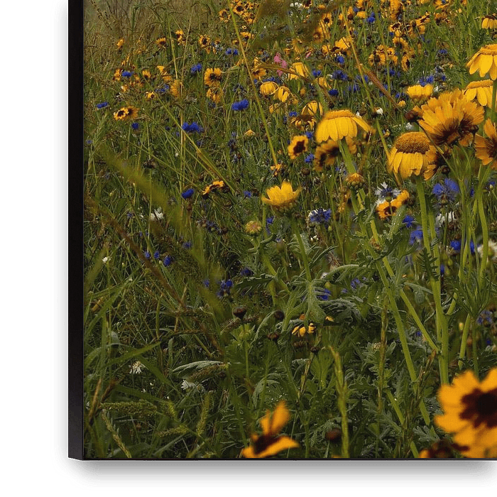 Buy this flower art Wildflowers along the meadow with trees shrouded in mist on the horizon by Bram Lubbers on canvas, ArtFrame, poster and wallpaper, printed on demand in high quality.