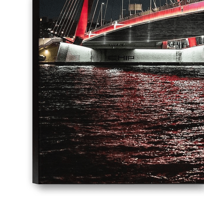 The Willemsbrug in Rotterdam, captured on a quiet night. The interplay between the red steel, dark water and city lights creates a powerful contrast that reflects the modern energy of the city. An ode to nocturnal tranquillity in a city that never quite sleeps, the soft grain pattern of the tall ISO enhances the nighttime feel and emphasises its timeless glow.