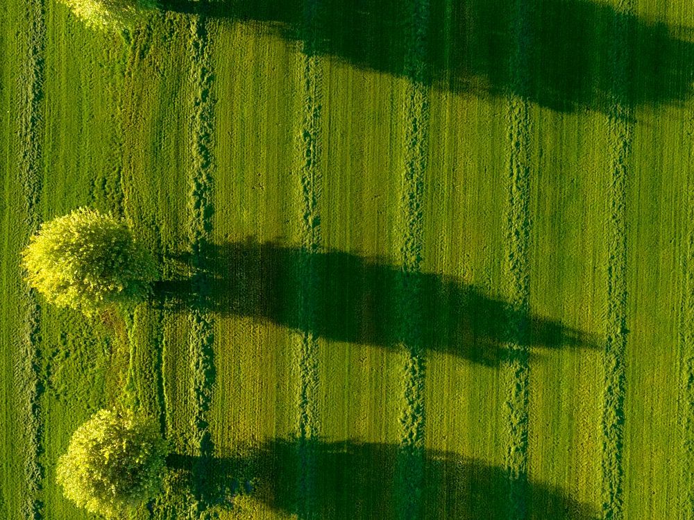 Willow trees in a freshly cut meadow during an early morning in the IJsseldelta region in Overijssel, Netherlands, seen from above.