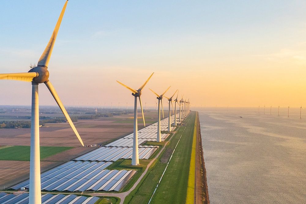 Rows of wind turbines and solar panels on the IJsselmeer shore and offshore wind turbines in the background in the Noordoostpolder in Flevoland, The Netherlands, during a springtime sunset seen from above.