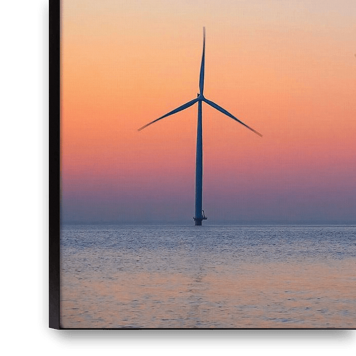 Wind turbines producing sustainable renewable energy in an offshore wind park at the IJsselmeer in Flevoland during sunset. Photo from the water level of the calm lake with the wind turbines on the horizon.