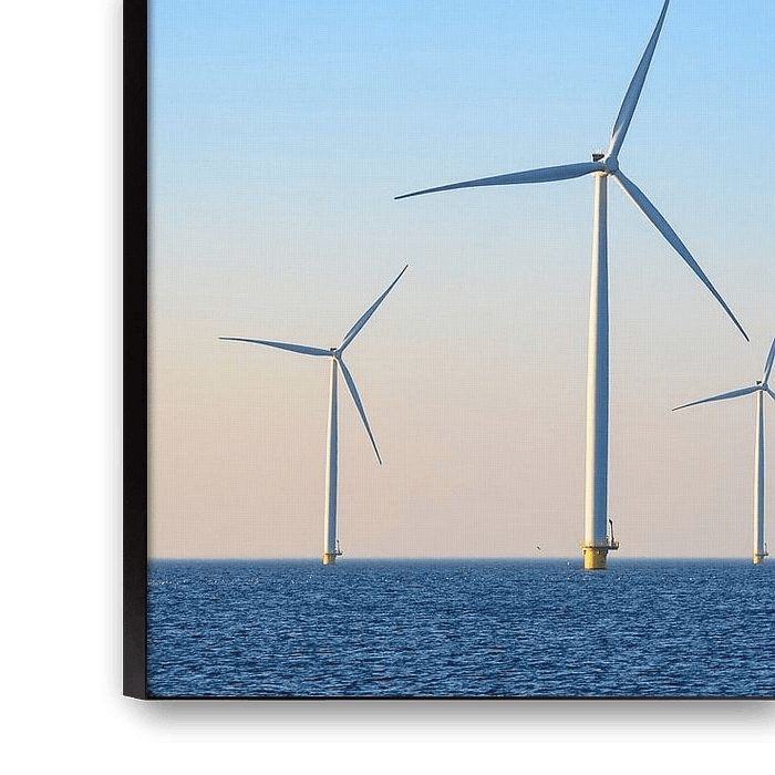 Wind turbines producing sustainable renewable energy in an offshore wind park at the IJsselmeer in Flevoland during sunset. Photo from the water level of the calm lake with the wind turbines on the horizon.