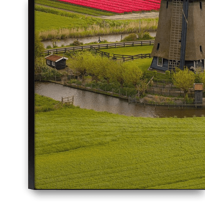 Buy this landscape artwork Windmill among red tulip fields by Ewold Kooistra on canvas, ArtFrame, poster and wallpaper, printed on demand in high quality.