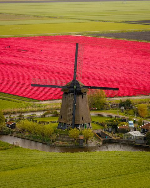 This impressive drone photo shows a classic Dutch windmill surrounded by vast fields of red tulips in full bloom. The powerful colour contrast between the fresh green, the bright red flower field and the tranquil water features creates a dynamic and harmonious image.