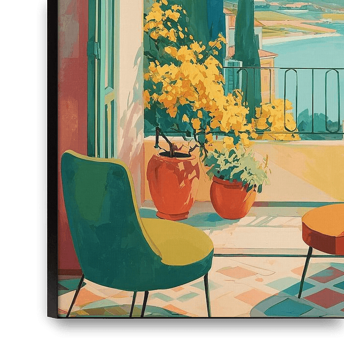 A work of art that captures an intimate moment: two chairs invite you into a warm interior with terracotta walls, while an open window with a green frame reveals a breathtaking landscape. Cypresses contrast beautifully with soft clouds, yellow flowers whisper of summer days, and the light's subtle poetry creates a dreamlike space…