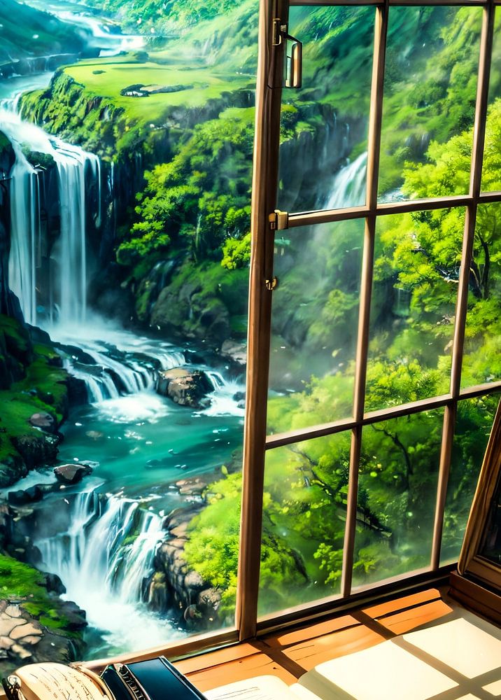 A magical study with an open window revealing a breathtaking valley of waterfalls and mountains. This enchanting artwork invites you into a quiet study filled with books, where sunlight pours onto the desk and pages of an open journal. Beyond the window lies a fantastical valley — towering green mountains, cascading waterfalls, and a serene turquoise river winding through the land. It’s a scene that blends reality with imagination, as if the world outside is the story unfolding within the books. Perfect for dreamers, writers, fantasy lovers, or anyone who seeks inspiration from the beauty of nature and storytelling.