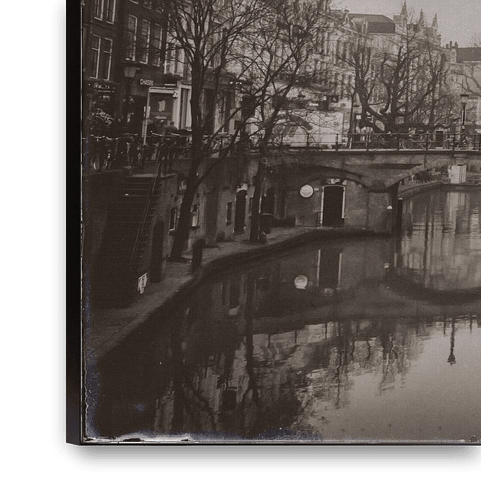 Dit is de Winkel van Sinkel aan de Oudegracht in Utrecht. Op de voorgrond het water van de Oudegracht, met in de verte de Bezembrug. De foto is genomen vanaf de Stadhuisbrug.