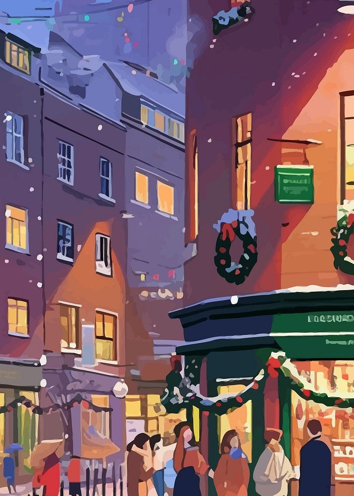 A charming winter cityscape in cartoon style features whimsical, snow-covered buildings with colorful rooftops and twinkling lights. Playful snowflakes dance through the air, while cheerful characters, bundled in cozy scarves