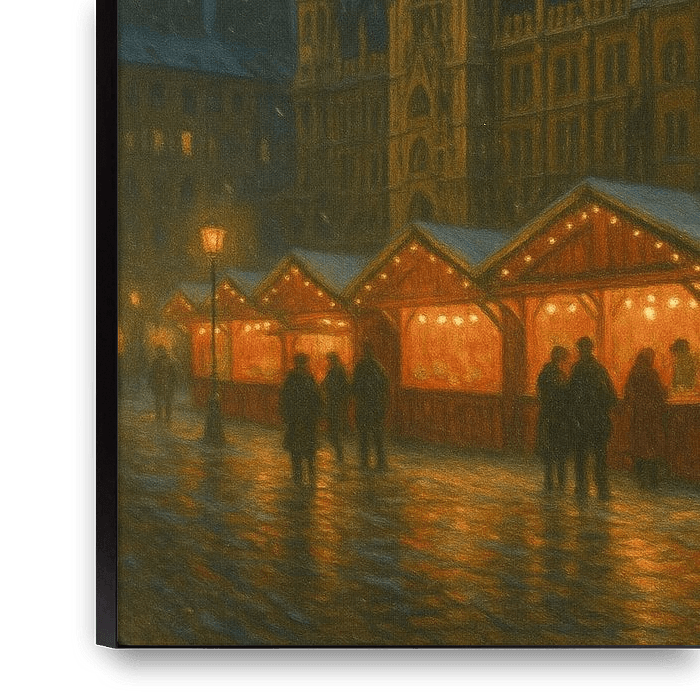 This painting captures the Munich Christmas Market in Marienplatz, where the Gothic tower of the Neues Rathaus rises into a snowy sky. Wooden stalls, glowing with soft light, line the square below, their red façades reflecting on the wet pavement. Gentle snowflakes fall as lamps flicker against the cold Bavarian air.