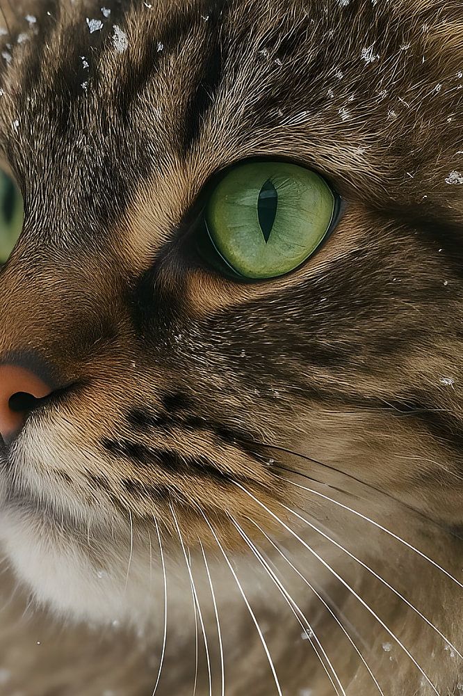 During a winter walk, I unexpectedly encountered this cat, calmly sitting while snowflakes gently settled on its fur. Its piercing green eyes told a silent story — calm, alert, and quietly present in a world turned white.