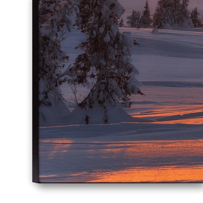 A landscape photo where the sun almost sets on a snowy plateau in Norway. The sun makes a bimbo behind a hill and gives the landscape an orange and red glow. There are conifers that are covered with a lot of snow.