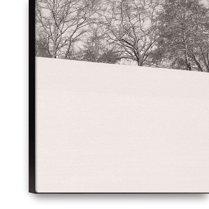 Photograph of a wintry landscape with minimalist-style trees in black and white, toned.