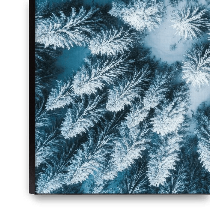 A woolly carpet of snow-covered fir trees spreads out as if nature itself has been dusted with icing sugar. The symmetrical arrangement of the trees creates a mesmerising pattern reminiscent of the delicate play of light and shadow. A moment of tranquillity, captured in the wintry stillness of the forest.