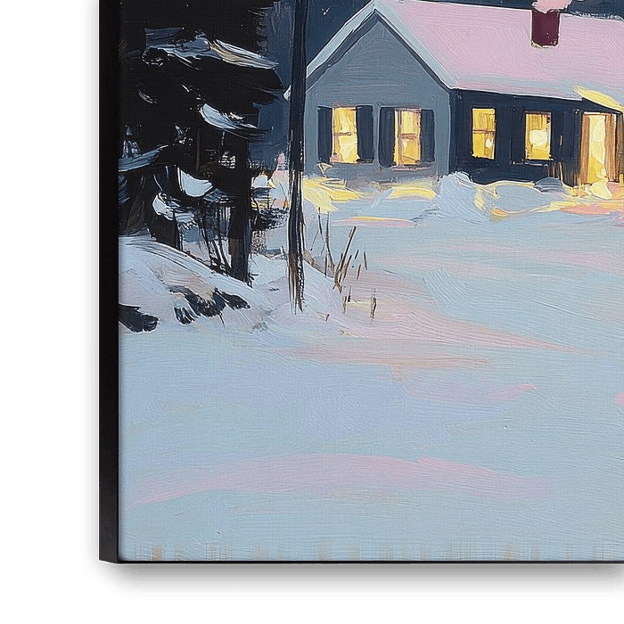This impressionist painting shows a grey house with a snow-covered roof in a wintry landscape. The windows radiate a warm yellow colour, while smoke rises from the chimney into the pink sky. Surrounded by bare, dark trees, the house lies on a field of snow with delicate shades of blue and pink. The loose brushstrokes emphasise the calm, peaceful atmosphere of the scene. The soft colour gradients and the harmonious composition convey a sense of calm and security. The painting captures the melancholy beauty of winter and emphasises the house as the central element in a harmonious, tranquil landscape.