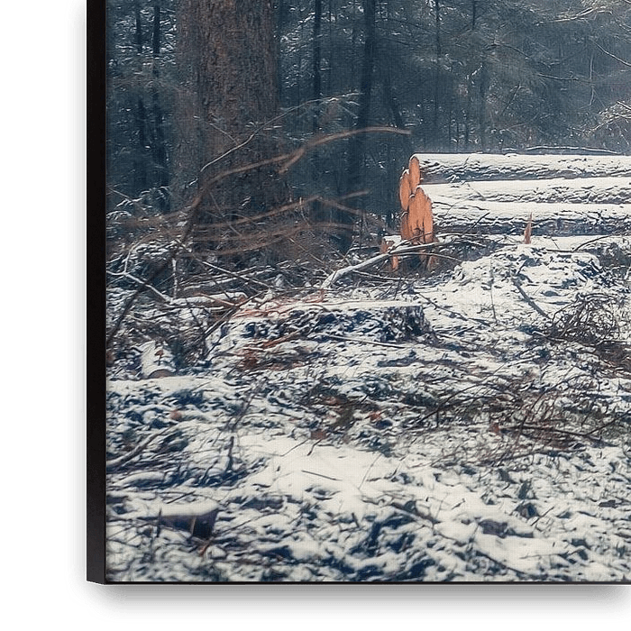 A winter morning in the Speulder forest behind forest house Three. There is still some fresh snow and the mist of cold hangs between the trees. The logs are ready to be collected and sawn.