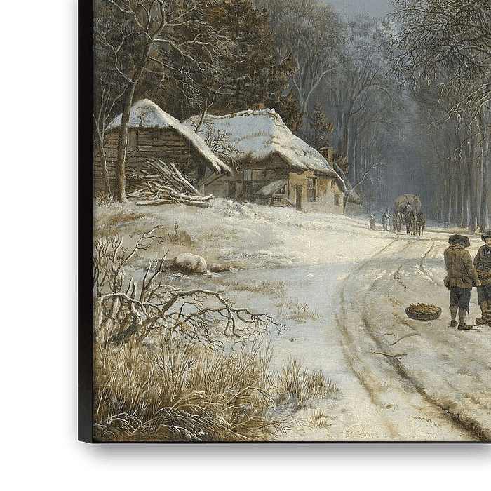 Winter landscape, Barend Cornelis Koekkoek, 1835 - 1838 For this winter landscape, Koekkoek chose a rolling landscape in Gelderland or the German area of the Lower Rhine. In contrast to his imposing forest scenes, this is a calm scene, with men pausing by a sledge laden with spruce and vegetables. In the distance, we see a misty panorama. The painting depicts tranquil nature on a winter's day, a world covered in the purity of snow.Rijksmuseum Rights: CC0
