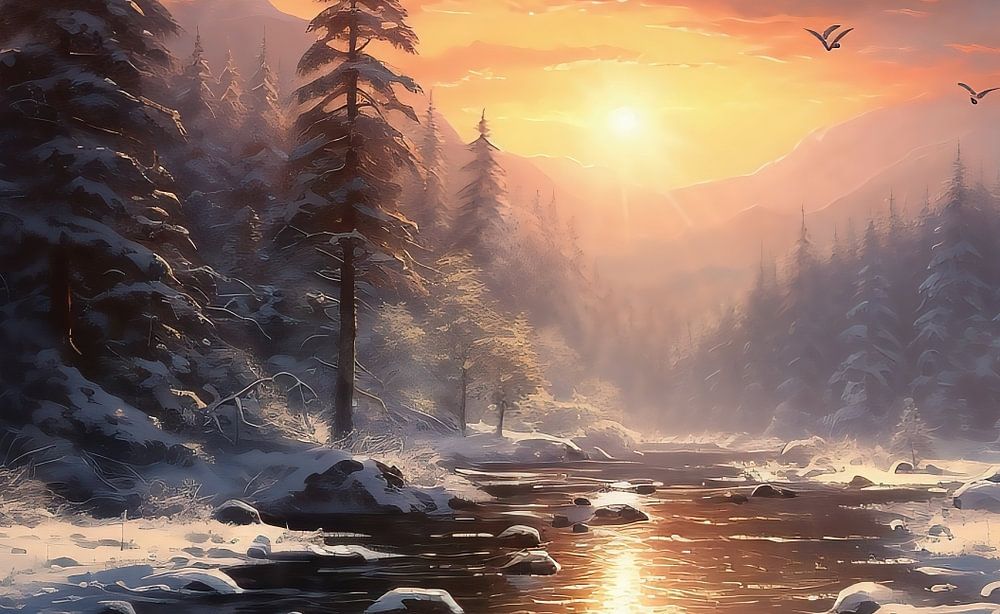 Buy this landscape artwork Winter landscape at sunrise by fernlichtsicht on canvas, ArtFrame, poster and wallpaper, printed on demand in high quality.