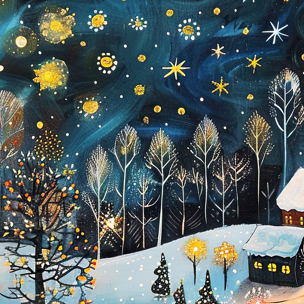Magic realism: The sparkling starry sky, atmospheric lights, and detailed textures give the work a dreamy, almost fairy-tale feel.