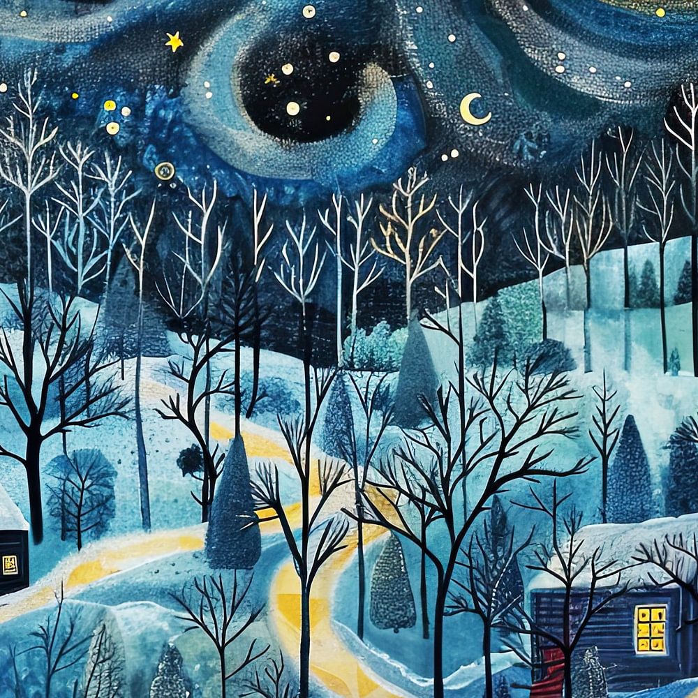 A winter night and a swirling starry sky full of light and movement. The winding path, lit by a soft golden glow, leads to cottages that radiate warmth and security, while the landscape is surrounded by majestic trees and winter silence.