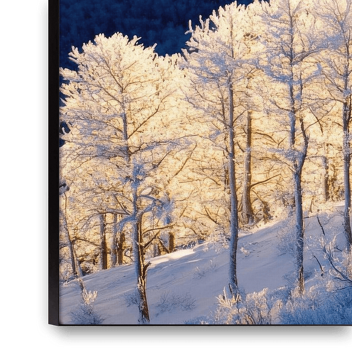 A magical winter wonderland unfolds, where delicate trees shine in a sparkling dress of hoarfrost. The gentle hills in the background surround the scene with soft plays of light, while the golden morning sun transforms the frosty branches into a luminous spectacle. A harmonious symphony of cold and warmth that invites you to dream.