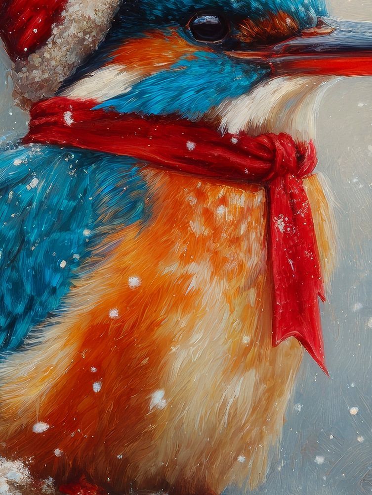This painting captures the magic of winter in a playful and atmospheric scene. A colourful kingfisher, with his shiny blue feathers and warm orange breast, sits proudly on a snowy branch. He wears a red Santa hat with a soft white brim and a matching scarf that gives him a festive look. As the snowflakes gently swirl down, the bird looks both brave and endearing, ready to brave the cold. The soft brushstrokes and subtle lighting give the artwork a warm, picturesque feel, despite the winter backdrop. The contrast between the vibrant colours of the bird and the cool tones of the background makes this work striking and enchanting. This painting exudes Christmas cheer, cosiness and a touch of humour. Perfect for the holidays, but also a happy reminder of the beauty of nature in winter afterwards.