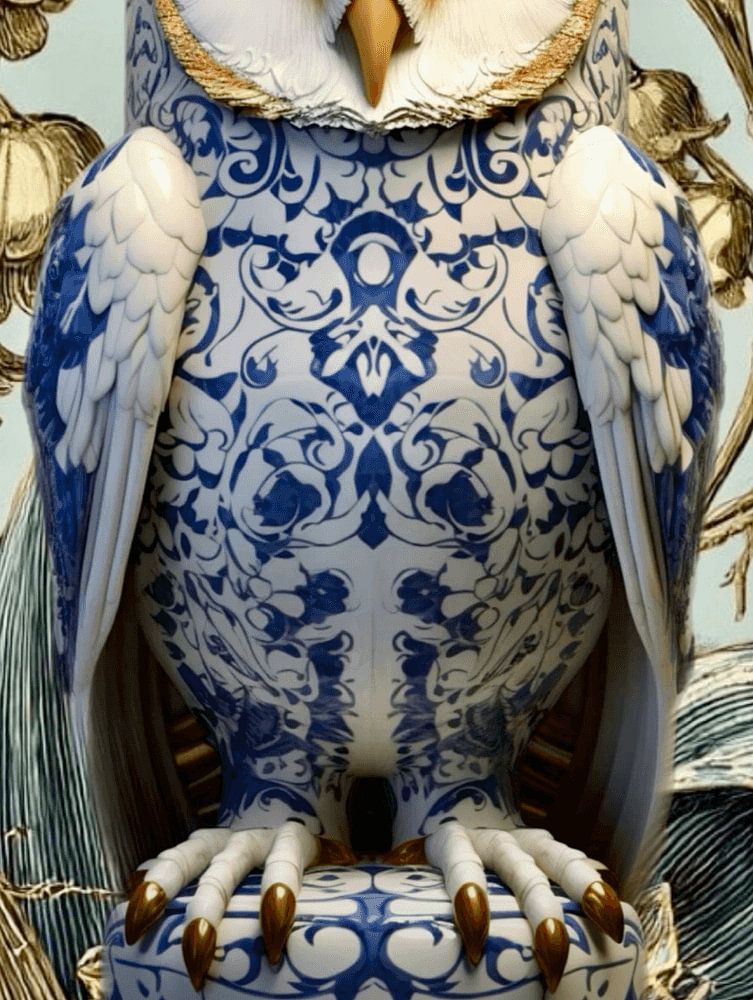 The wise owl, executed in the iconic shades of Delftware. This artwork exudes wisdom and timeless elegance. Traditional colours meet modern design making it a striking work.