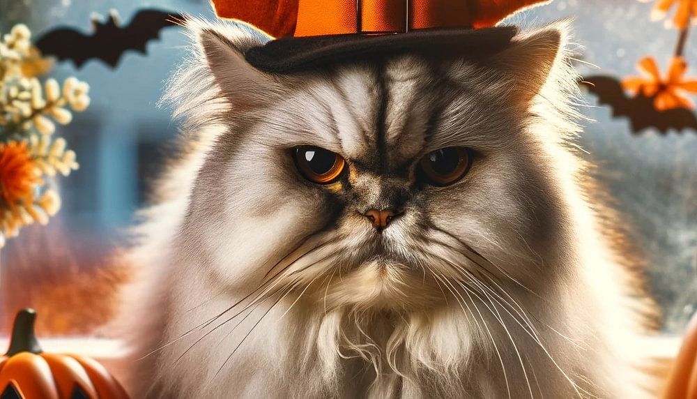 The picture of a stately Persian cat in a witch's hat can be seen in a festively decorated windowsill. The Halloween decorations with carved pumpkins and a collection of autumn flowers in the background give the picture a warm, seasonal atmosphere. The cat itself, with a seemingly grumpy expression, is the centrepiece of this scene. She sits there, surrounded by the colours of autumn and the symbols of the spooky festival, adding to the mood despite her unenthusiastic look. The soft lighting highlights the soft texture of her fur and plays with the shadows of the decoration, further enhancing the deep, golden colour palette of the image.