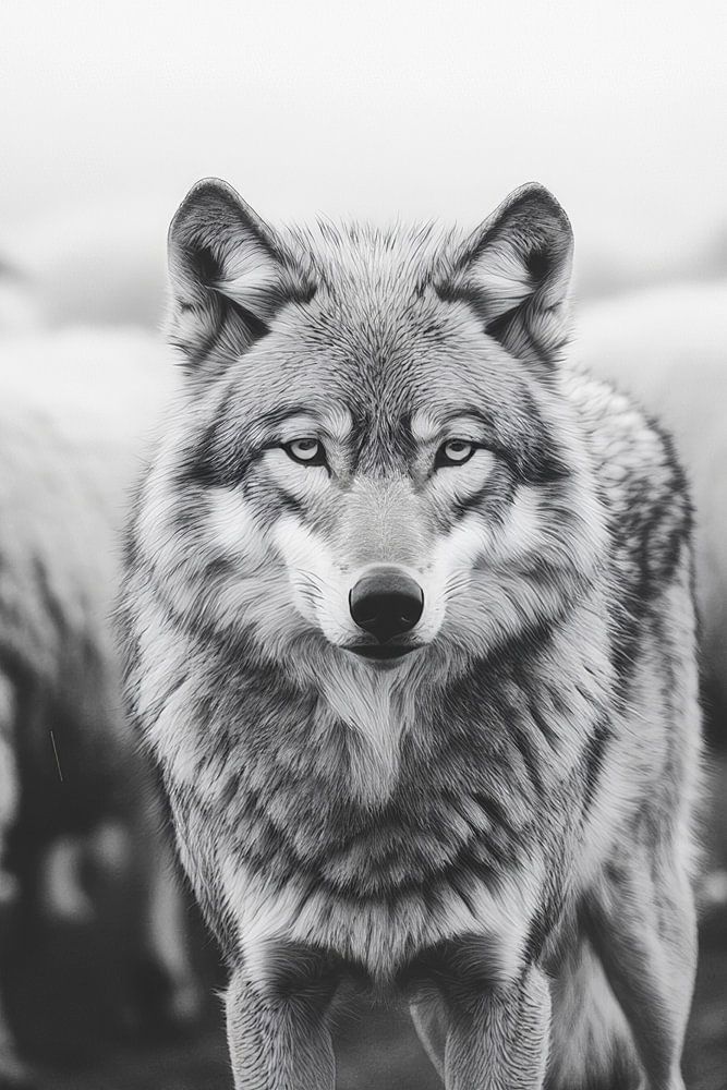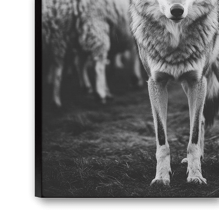In a melancholy black and white atmosphere, majestic wilderness meets gentle sociability. The impressive wolf, with sharp eyes and powerful stature, breaks through the quiet herd. This work of art is perfect for a living room, where it stimulates conversation and showcases the beauty of nature.